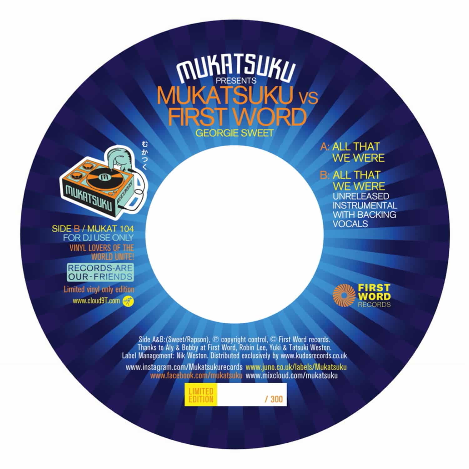 Sublime soulfulness from Georgie Sweet, the Bournemouth-born, Brighton-based singer/songwriter tipped by the likes of Gilles Peterson and Jazz FM's Tony Minvielle for big things with a track taken from the ' I Swear To You' long player .On this collaboration with First Word Records Sweet's heavenly voice is very much at the centre of 'All That We Were', with dazzling close harmony work gliding gracefully across a laid back groove that slopes along in nicely lazy fashion.This release from the ever reliable Mukatsuku label gives DJs extra flexibility with a flipside version that eaves the lead lines out but leaves the groove and the soothing backing vocals intact. Sweet, in more ways than one.[info sheet from distr.]