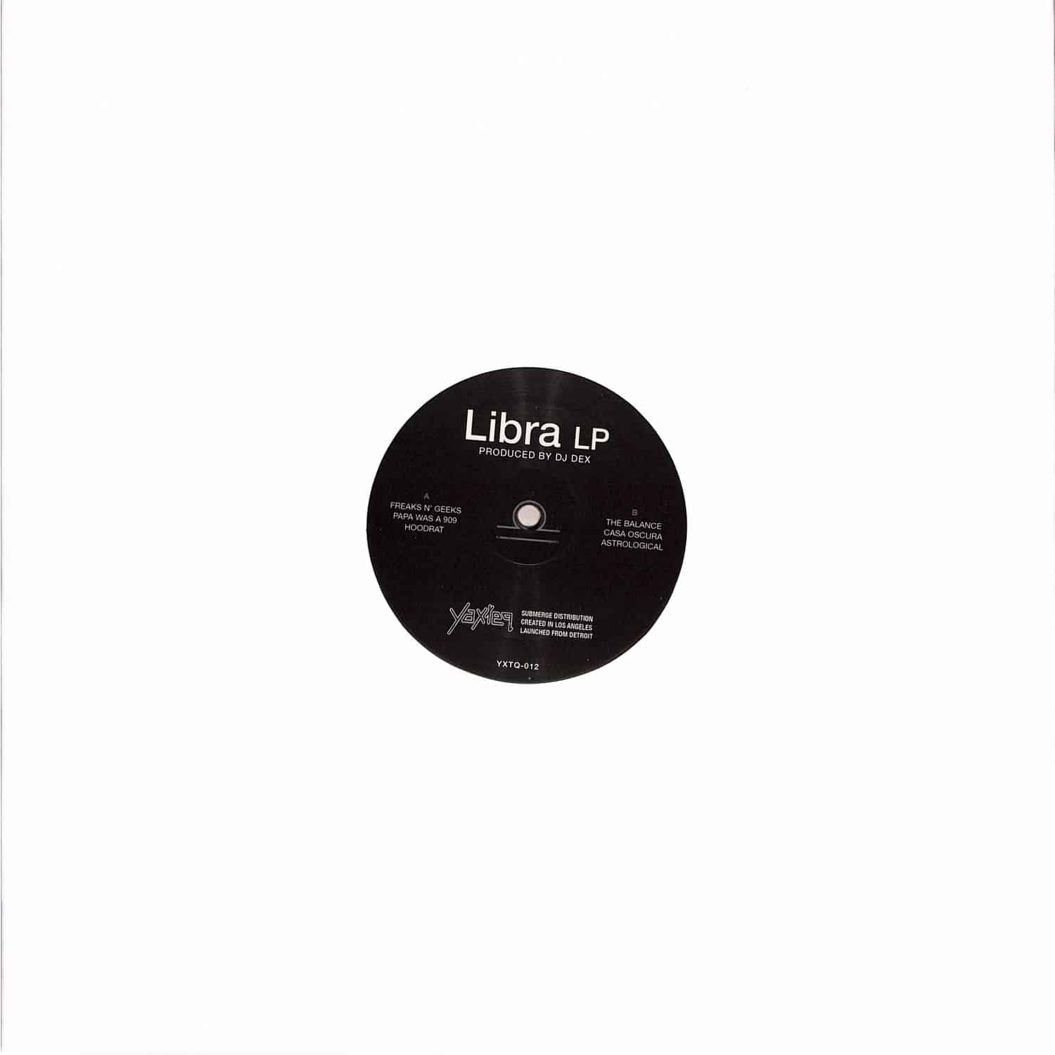 The Libra LP finds DJ Dex searching for the perfect balance on the dancefloor. "Freeks N' Geeks" is a shameless party anthem asking dancers to get their geek and their freak on with stomping kick drums, percussion, acid funk, and hands-in-the-air horns. "Papa Was a 909" reinvents a classic Motown anthem via a relentless 909 drum machine workout. "Hoodrat" pays homage to Detroit minimalism and Chicago jack—doubles are essential for the creative DJ. "The Balance" merges an 808 kit with clever percussion, melodic chords, and sci-fi synths for a tense, building track ready for peak-time action. "Casa Oscura" takes equal inspiration from hi-NRG disco tracks and the funkiest aquatic synths of Drexciya for a vibe entirely its own. "Astrological" is the LP's polyrhythmic, thumping, big-room techno cut where cascading synth lines meet atmospheric pads and vocal samples.[info sheet from distr.]